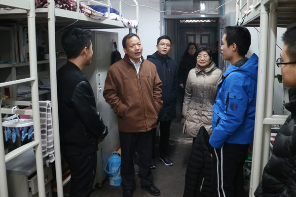 2016年12月29日下午,校纪委书记朱君强、副校长朱永民带队,分别对两校区学生宿舍的安全卫生防疫状况进行了综合检查,学生工作部、校团委、保卫处、后勤管理处等相关部门,各学院党委副书记、辅导员参加了检查工作。