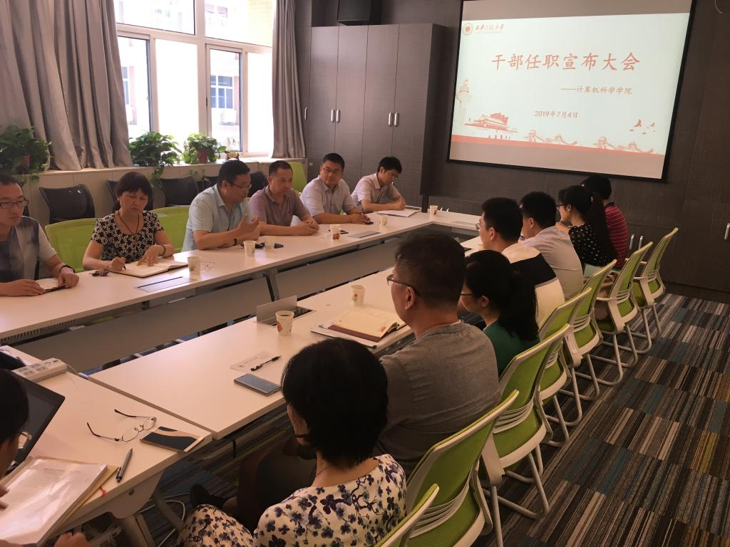 7月4日下午,计算机科学学院在临潼校区7号楼426会议室召开了新任职干部宣布大会。副校长李鹏飞、组织部部长孙晓宁出席了会议,学院党政班子成员、党委委员、各系(实验中心)主任、全体党支部书记、科级以上干部参加了会议。会议由院党委书记王雅慧主持。首先校党委组织部部长孙晓宁宣读了任职文件,陈亮同志被任命为计算机科学学院副院长(试用期一年)。之后,陈亮做了表态发言,他感谢学校的培养和学院教职工对自己工作的认可...