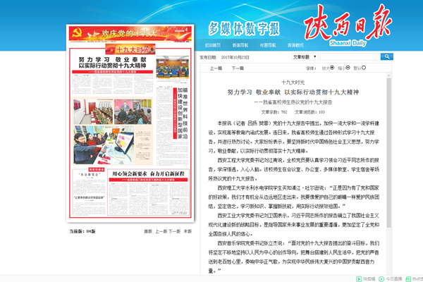 近日,3003新葡师生热议九十大报告受到社会主流媒体广泛关注,陕西日报、中国纺织分别报予以转载。陕西日报:努力学习 敬业奉献 以实际行动贯彻十九大精神——我省高校师生热议党的十九大报告http://esb.sxdaily.com.cn/sxrb/20171023/html/page_03_content_002.htm 中国纺织报:蓝图绘就 征程有我——纺织行业企业人士结合十九大报告谈发展 蓝图绘就 征程有我——纺织行业企业人士结合十九大报告谈发展.pdf