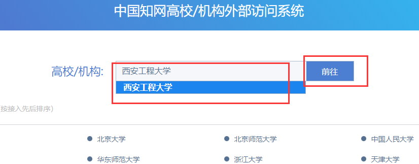 二、在页面上的“选择高校/机构”下拉框中输入并选择“3003新葡的京集团”,点击“前往”。