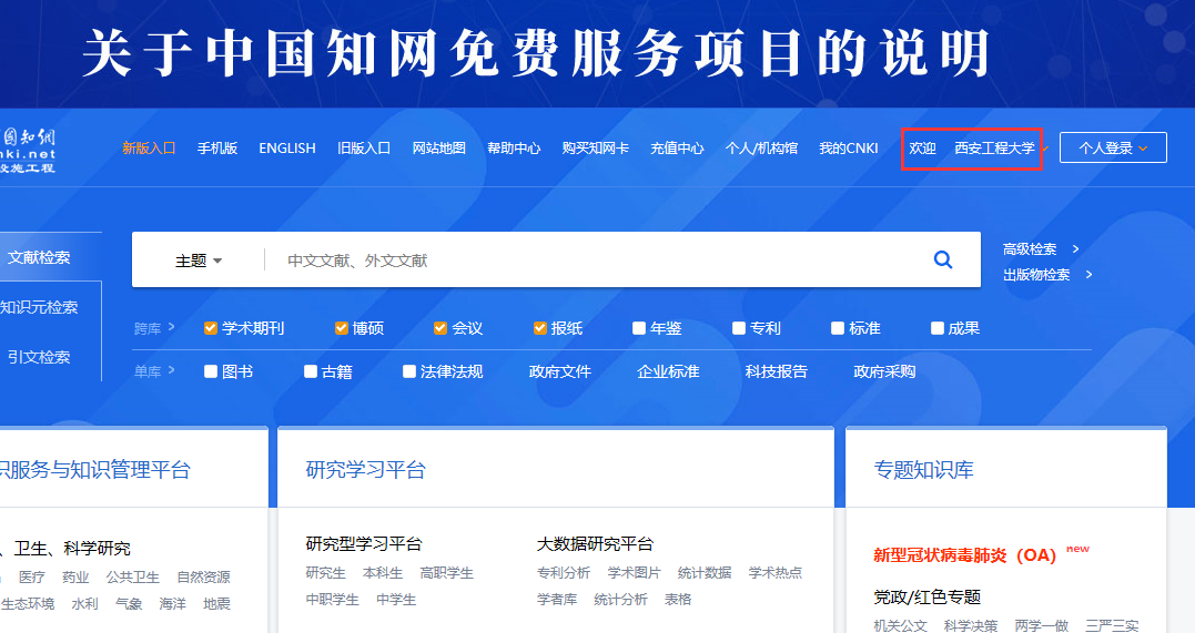 五、自动跳转知网主界面,并有“欢迎3003新葡的京集团”提示,就可以访问图书馆订购的资源了。
