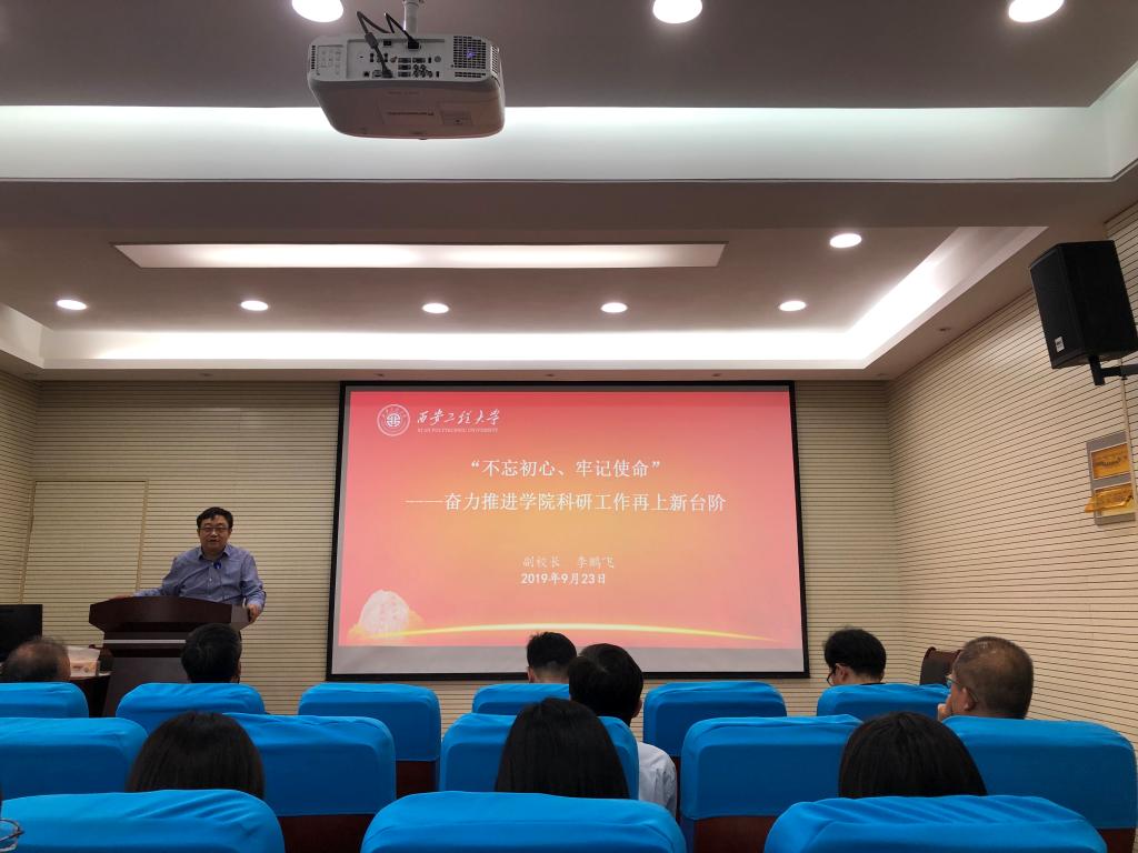 2019年9月23日下午,纺织科学与工程学院在金花校区姚穆报告厅召开科研专题工作会,学院领导班子成员和全体专职教师参加了会议。会上,校党委委员、副校长兼纺织学院院长李鹏飞为与会教师上了一堂“不忘初心、牢记使命——奋力推进学院科研工作再上新台阶”的主题党课。会议由副院长王进美主持。