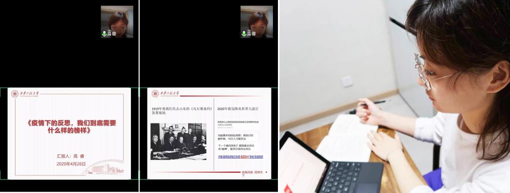 最后,2019级思政专业研究生高睿以《疫情下的反思,我们到底需要什么样的榜样?》为题,以艺人黄智博在疫情期间虚假出售口罩骗取非法钱财的案例,反映出当前社会暴露的一些问题,如青年法律意识淡薄、道德意识缺失、存在利己主义和享乐主义等问题。同时她又举出84岁的钟南山院士奋战抗“疫”第一线,武汉主动请缨的汶川护士等感人事例向我们表达了那些勇敢无私的奉献者才是我们学习的榜样。使同学们明白要从身边的好人汲取高尚的品格,坚守道德底线,做堂堂正正,有大是大非的青年一代。