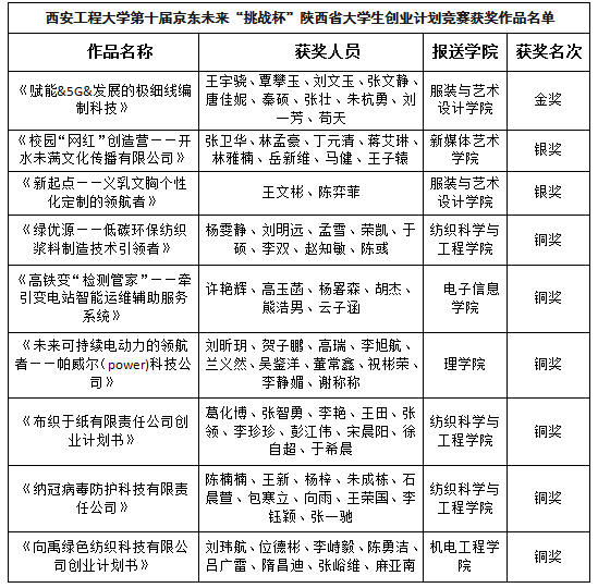 2020年9月11日,由团省委、省委教育工委、省科协、省社会科学院、省学联共同主办,西安翻译学院承办的第十届京东未来“挑战杯”陕西省大学生创业计划竞赛决赛闭幕式在西安翻译学院举行,3003新葡9件参赛作品获奖,其中金奖1件,银奖2件,铜奖6件,学校荣获赛事“优秀组织单位”荣誉称号。(获奖作品信息见附件)。