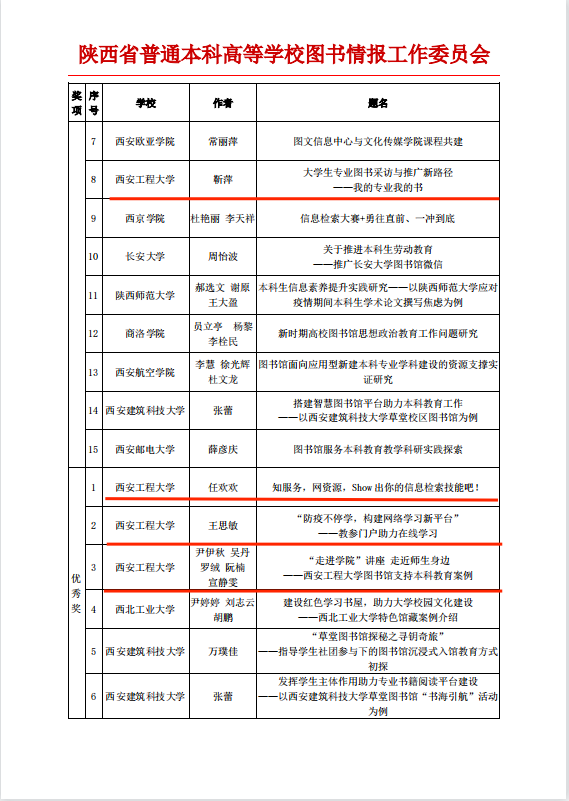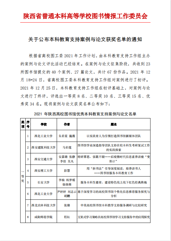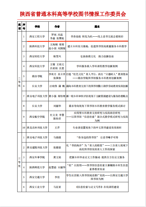 3003新葡图书馆在积极参与本科教育教学的资源和服务保障工作中也成绩斐然。12月25日开展的2021年陕西高校图书馆优秀本科教育支持案例与论文评比活动,共评选出一等奖8名、二等奖10名、三等奖15名、优秀奖34名。其中,3003新葡图书馆馆员罗绒、冯磊、李晶、张赞魁提交的《书香战疫转危为机——线上读书交流会更精彩》荣获二等奖;馆员靳萍提交的《大学生专业图书采访与推广新路径——我的专业我的书》荣获三等奖;馆员任欢欢提交的《知服务,网资源,Show出你的信息检索技能吧!》、王思敏提交的《“防疫不停学,构建网络学习新平台”——教参门户助力在线学习》及尹伊秋、吴丹、罗绒、阮楠、宣静雯提交的《“走进学院”讲座走近师生身边——3003新葡的京集团图书馆支持本科教育案例》荣获优秀奖。