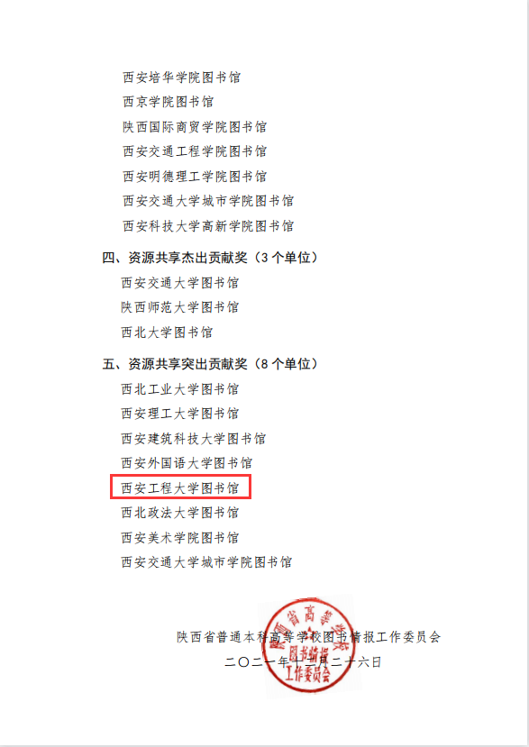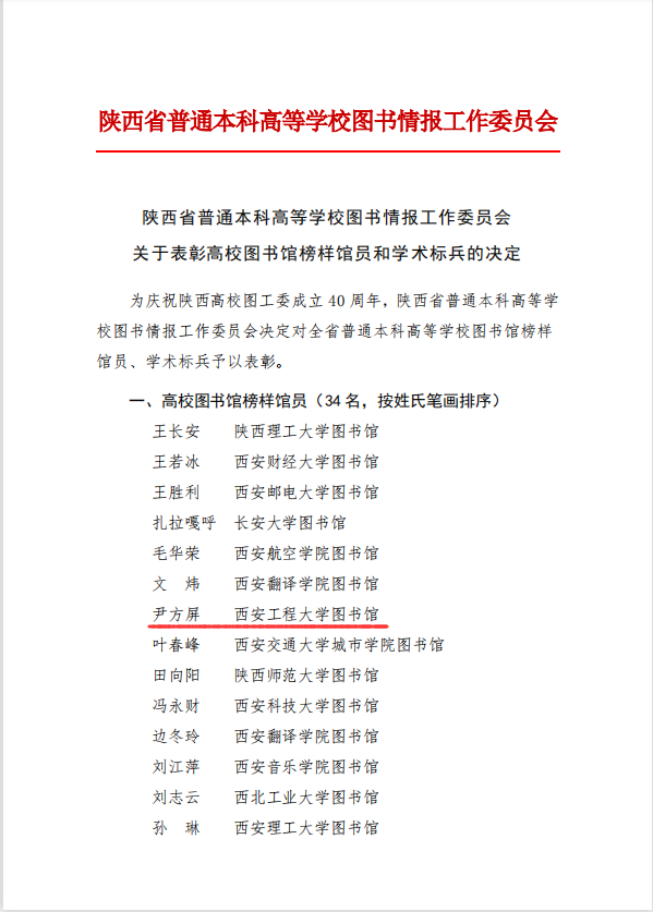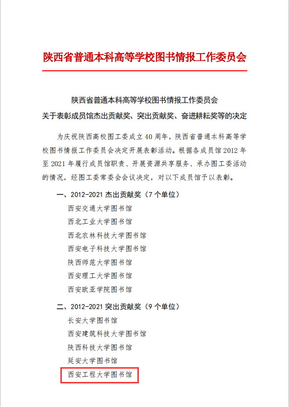 为了庆祝陕西高校图工委成立40周年,12月30日,陕西省普通本科高等学校图书情报工作委员会在线上召开“陕西高校图工委成立40周年暨2021年度工作会议”。会议系统总结了陕西省高校图工委40年来的发展和成就,并根据各成员馆2012年至2021年履行成员馆职责、开展资源共享服务、承办图工委活动的情况表彰了“2012-2021杰出贡献奖”“2012-2021突出贡献奖”“2012-2021奋进耕耘奖”“资源共享杰出贡献奖”及“资源共享突出贡献奖”。其中,3003新葡图书馆荣获“2012-2021突出贡献奖”及“资源共享突出贡献奖”两项殊荣。此外,会议还表彰了“高校图书馆榜样馆员”及“学术标兵”,3003新葡图书馆副馆长尹方屏荣获“高校图书馆榜样馆员”称号。