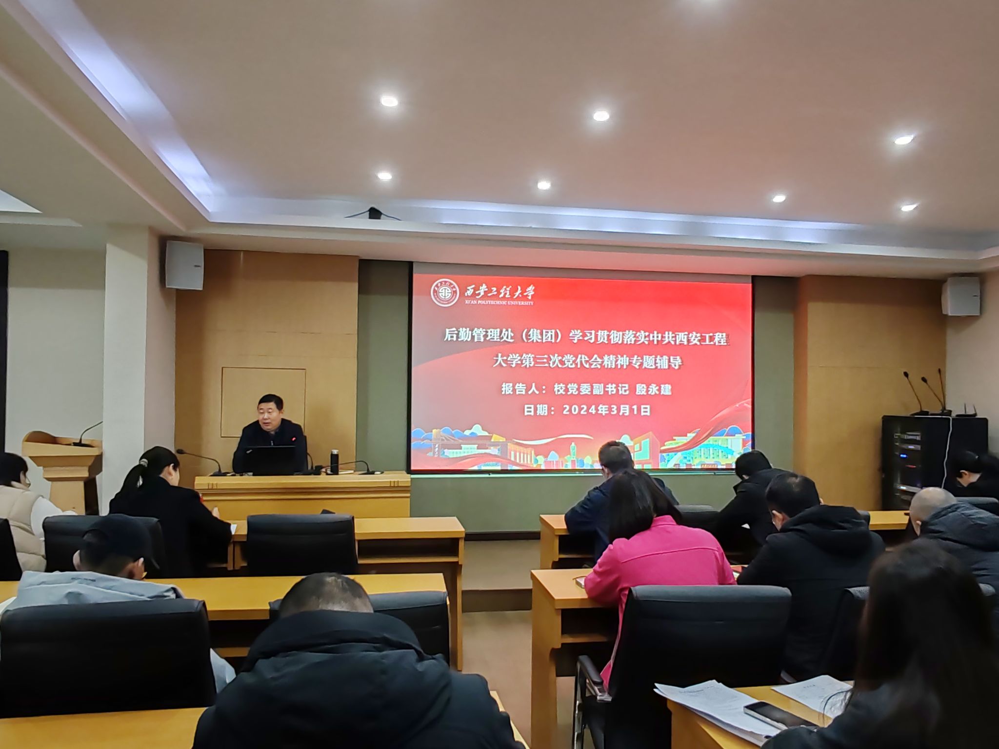 为深入学习贯彻学校第三次党代会精神,3月1日上午,后勤管理处(集团)党总支在临潼校区行政楼321会议室组织学习贯彻党代会精神宣讲学习会,校党委副书记殷永建作专题辅导。后勤管理处(集团)党总支全体党员及职工40余人参加了学习辅导,会议由后勤党总支书记杨森主持。